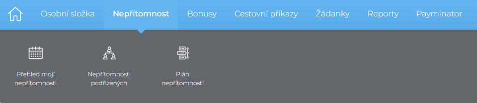 Nadřízenému zaměstnanci, který je i zároveň nastaven v administrační konzoli jako HR administrátor se zobrazí následující záložky v modulu Nepřítomnost: