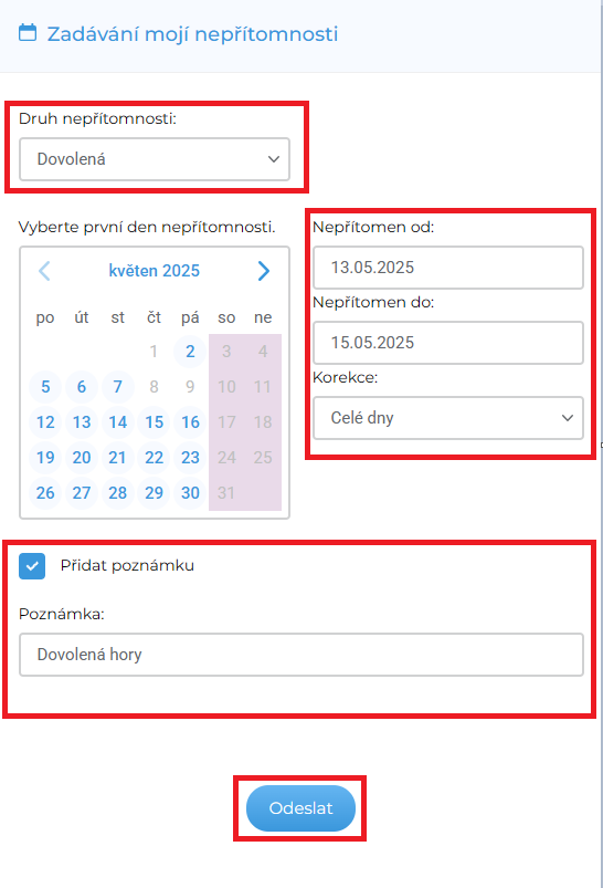 - Nepřítomnost ke schválení odešle tlačítkem „Odeslat“.
