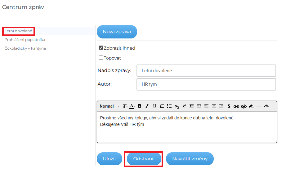 Topovat – Pokud údaj označíte, zobrazí se zpráva na úvodní stránce mezi zprávami na prvním místě a její název bude zvýrazněn červeně.