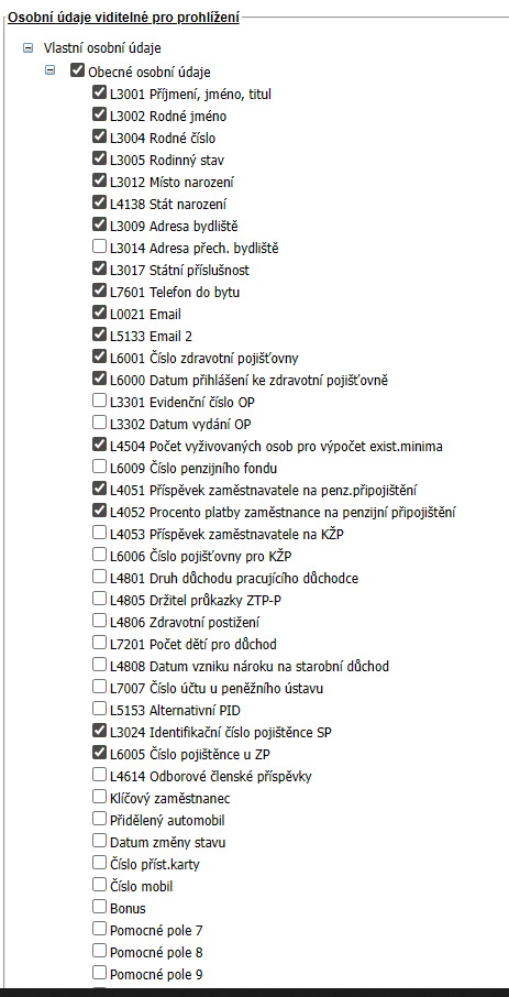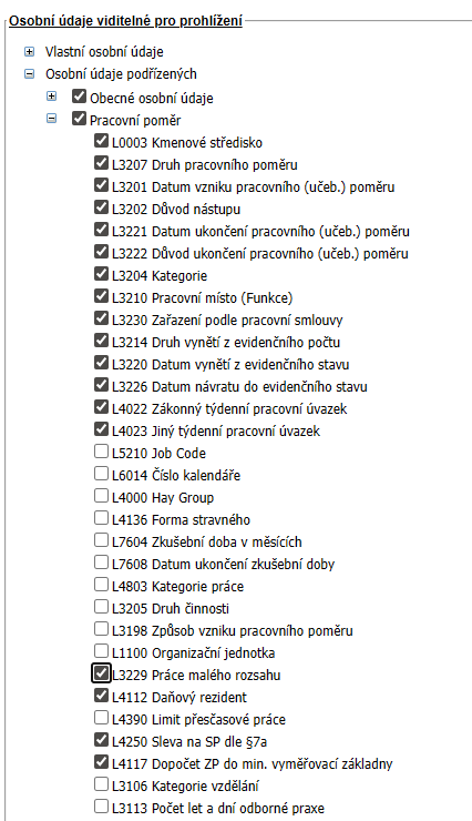 Osobní údaje podřízených: Nadřízený zaměstnanec uvidí u svých podřízených pouze ty údaje, které se v této části označí.