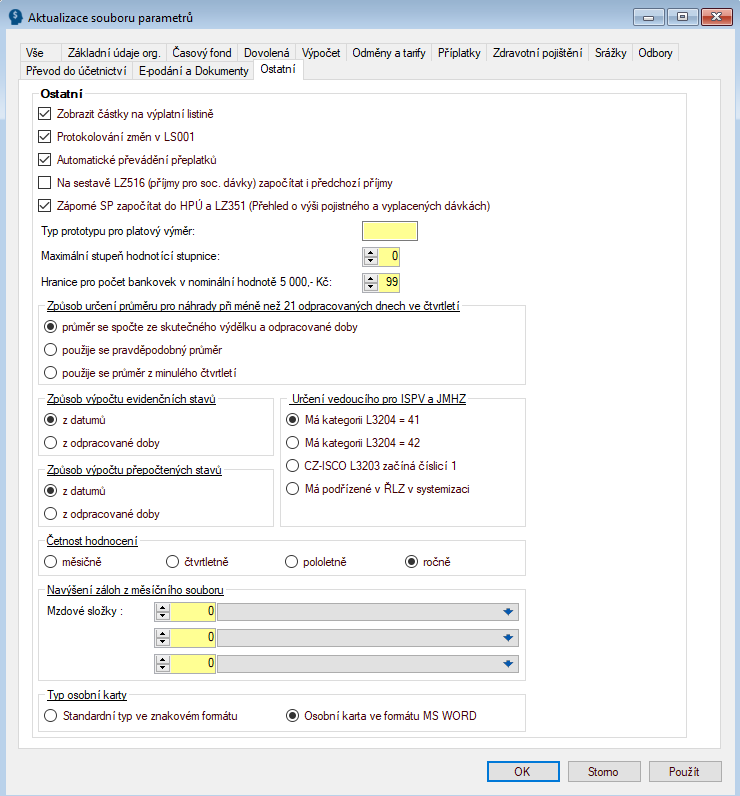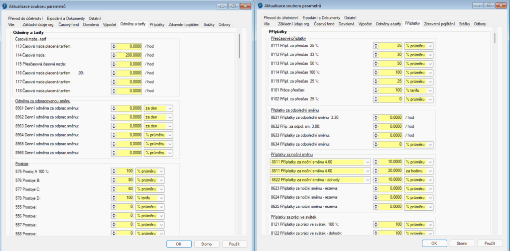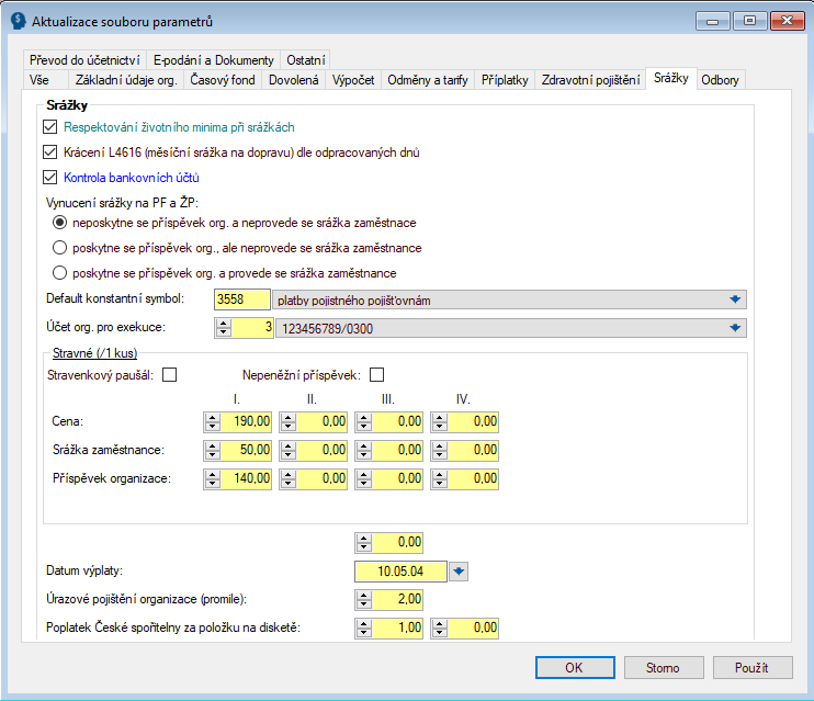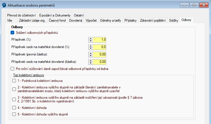 - Parametry související s odborovými příspěvky (určení procentního či pevného příspěvku a příspěvku v % či pevné částky u osob na mateřské dovolené)