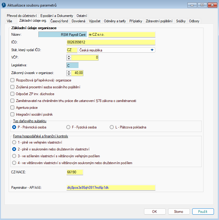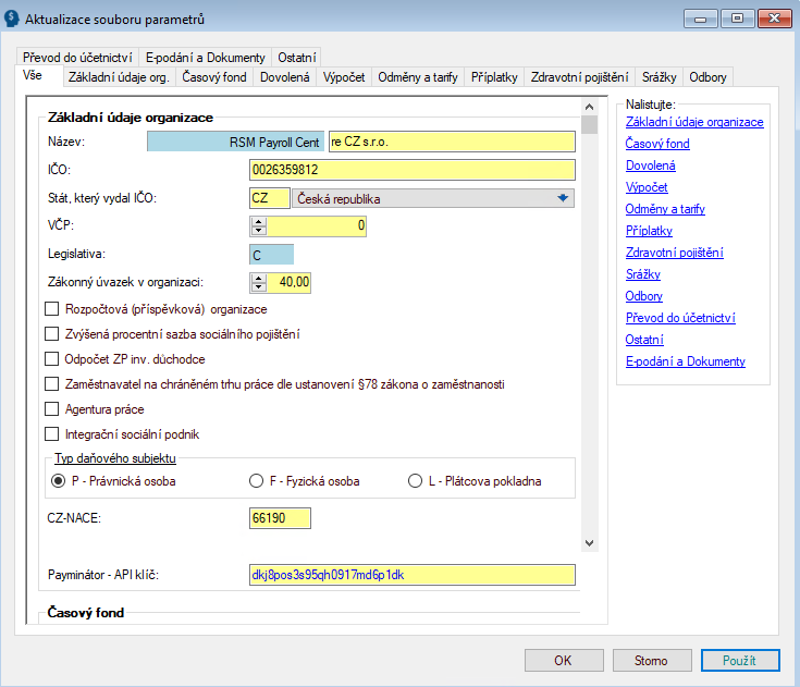 Aby celý komplex mzdového a personálního programu správně fungoval, je třeba nastavit parametry a hodnoty odpovídající každé organizaci. Toto základní nastavení firmy se provádí v parametrickém souboru ve funkci Mzdy 2-7-1.