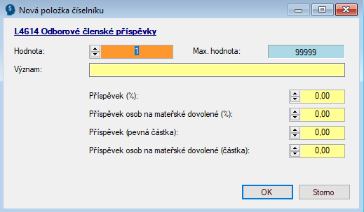 - Funkce Mzdy 2-4-3 „Kmenové údaje“ – číselník L4614 „Odborové členské příspěvky“.