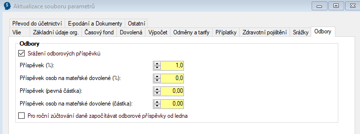 - Parametr „Pro roční zúčtování daně započítávat odborové příspěvky od ledna“ dříve ovlivňoval, do kterého měsíce se příspěvky započítají při ročním zúčtování. Nyní nelze uplatňovat členské příspěvky odborům jako daňový odpočet.