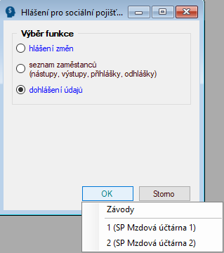 Ve funkci Pers 4-2-1 „Hlášení pro SP“ označte parametr „Dohlášení údajů“. Po potvrzení tlačítkem OK vyberete závod, za který chcete doregistraci zaměstnanců provést.